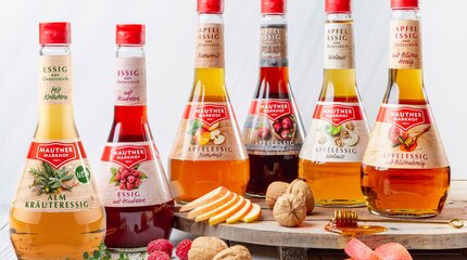 Ob sauer lustig macht, wissen wir nicht. Aber dass sauer Appetit macht, können wir beweisen – mit unseren zahlreichen Essigvariationen. Dazu zählen der von Mautner Markhof erfundene Hesperiden Essig, Österreichs beliebtester Essig und fester Bestandteil der heimischen Kulinarik, oder unsere Feine Auswahl Essige, wie der Apfelessig Barrique der in Eichenfässern gelagert wird. Allen Essigkreationen gemeinsam ist, dass sie aus besten Rohstoffen unter Verwendung altbewährter Hausrezepte und eigens entwickelter Produktionsmethoden im natürlichen Gärverfahren hergestellt werden. Modernste und nachhaltige Technik ist bei uns im Einsatz, um Essige mit feinem, unverwechselbar gutem Geschmack zu erzeugen. Denn wir möchten, dass Österreich sauer isst – und zwar mit Vergnügen!