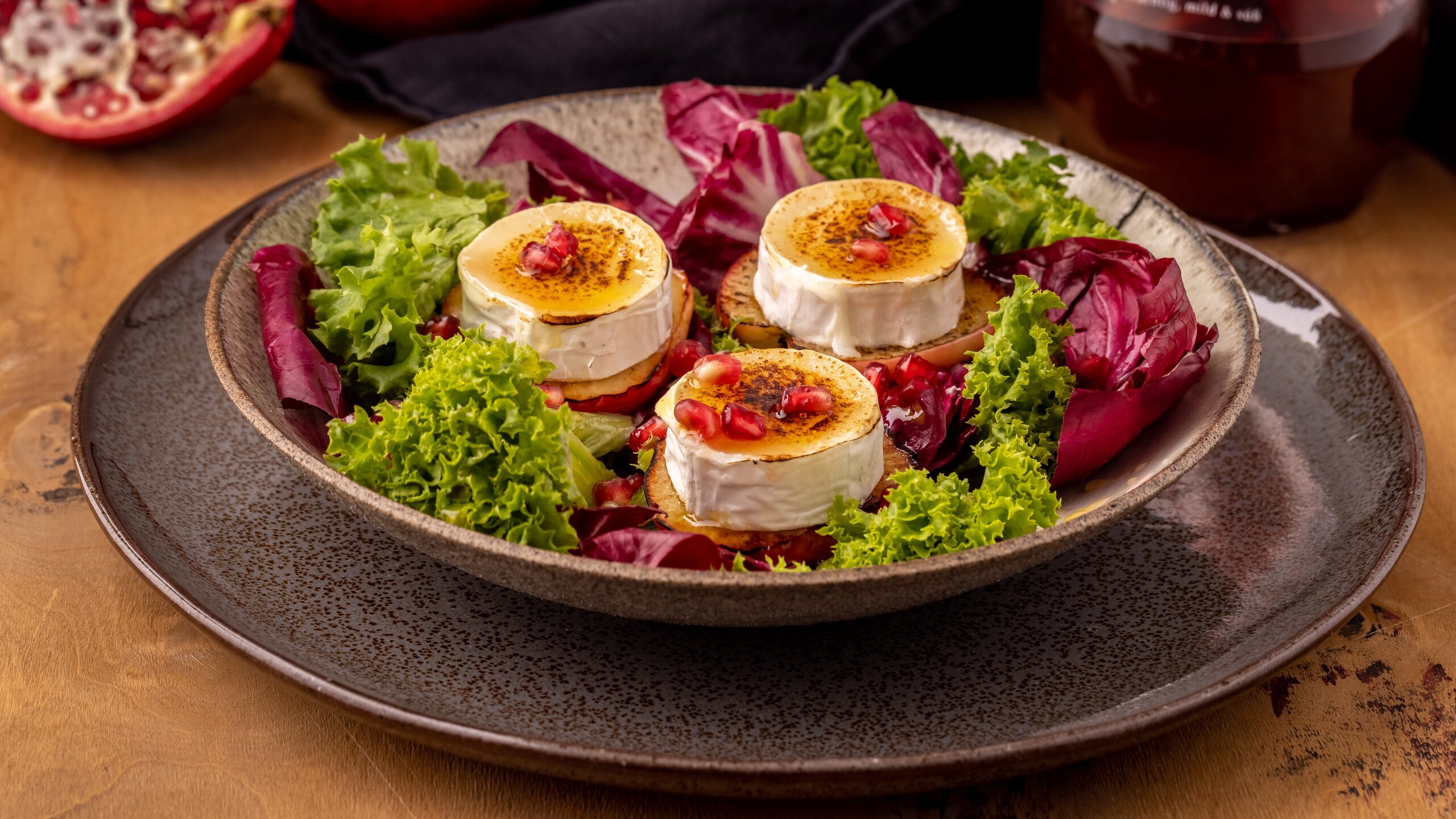 Die Blattsalate auf zwei Teller verteilen, den Apfel in dünne Scheiben schneiden und auf beiden Seiten in etwas Öl anbraten. Den Ziegenkäse ebenfalls in Scheiben schneiden und in Öl anbraten, bis sie schön hellbraun sind. Apfelspalten auf den Salat drapieren und den Ziegenkäse darauf legen. Für das Dressing alle Zutaten miteinander vermischen und glatt rühren. Den Salat damit marinieren. Mit den Granatapfelkernen garnieren.
