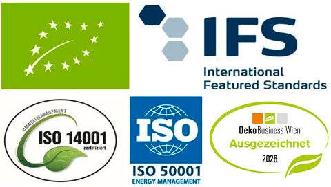 Als Produktionsbetrieb unterwerfen wir uns strengsten Normen der Produktsicherheit. Das betrifft den Einkauf von Zutaten ebenso wie die Verfahren der Herstellung und letztlich die Lieferung. Wir sind IFS Food 8, Bio-, ISO 14001 (Umweltmanagement) und ISO 50001 (Energiemanagement) zertifiziert. Außerdem sind wir von der Stadt Wien als ÖkoBusinessPlanBetrieb für nachhaltiges Wirtschaften ausgezeichnet.